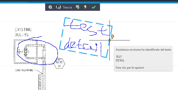 Le revisioni possono essere importate come file PDF, PNG o JPG e vengono sovrapposte al disegno nell'area di lavoro Traccia. Le revisioni nel file importato vengono automaticamente identificate come testom, multidirettrici e fumetti di revisione. Assistenza revisione consente di inserire nel disegno come geometria le revisioni identificate.
