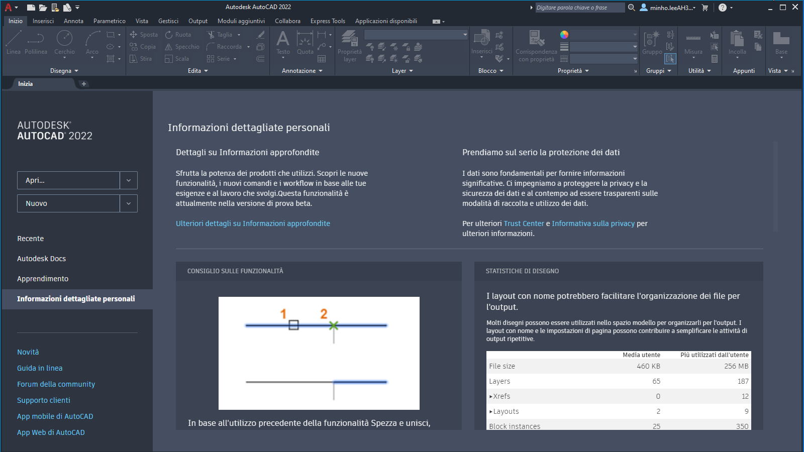 Le informazioni dettagliate sull'utilizzo del prodotto sono disponibili nella scheda Inizia. Informazioni dettagliate personali sono informazioni che vengono mostrate all'utente in base all'utilizzo di AutoCAD. Il contenuto è stato concepito per essere informativo e pratico. Sono forniti suggerimenti per i comandi e le funzionalità che è possibile provare con altre informazioni sulla produttività.