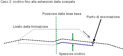 In modalità layout questo componente sezione tipo inserisce una linea orizzontale al di sotto del punto di associazione, verso la posizione della linea base. Questo collegamento viene inserito dal punto di associazione ad uno spessore uguale allo "spessore di scotico".
