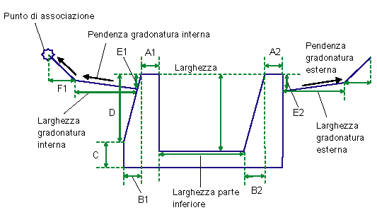 Il punto di associazione è il punto più interno della gradonatura interna facoltativa. Se le gradonature interne vengono omesse, il punto di associazione si trova sul punto più interno della parete interna della struttura di fosso.