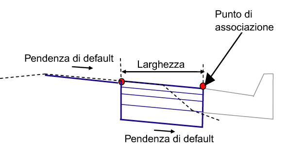 Nella figura che segue viene mostrata una situazione con un profilo di scostamento del ricoprimento. Se si specifica il profilo di ricoprimento, la pendenza viene calcolata tra la quota altimetrica del profilo in prossimità del bordo interno del ricoprimento e il punto di associazione.