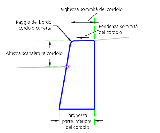 Il punto di associazione si trova nel bordo interno della pendenza iniziale in scavo o in rilevato. Questo componente può essere collegato al lato sinistro o destro.