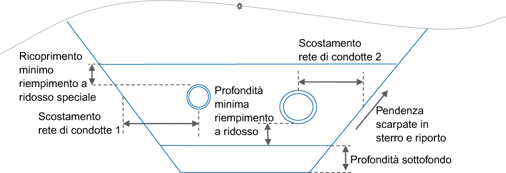 Quando sono selezionate due reti di condotte, si presupporrà che Rete di condotte 1 sia sul lato sinistro della linea base e Rete di condotte 2 sul lato destro del tracciato. Lo spessore del materiale di Spessore minimo riempimento speciale è determinato dal più elevato dei due diametri esterni della condotta, oltre allo spessore di Ricoprimento minimo riempimento speciale. Lo spessore del fondo della trincea è determinato dal più basso dei due diametri esterni della condotta, oltre a Spessore minimo riempimento speciale e Spessore del sottofondo.