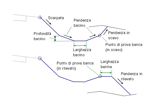 Questo componente sezione tipo inserisce i collegamenti per la creazione di un bacino (fosso ampio) e di una scarpata per la condizione di scavo o un bacino con una berma e scarpata per la condizione di rilevato.
