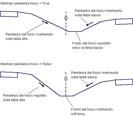 Le sopraelevazioni o le corsie di svolta possono rendere asimmetrico un fosso in quanto il lato destro e sinistro della sommità delle pendenze del fosso possono trovarsi a quote altimetriche differenti. Per risolvere questa situazione sono disponibili due alternative. Se Mantieni pendenza fosso è impostato su True, le pendenze di fosso specificate sono mantenute costanti su entrambi i lati, e il fondo del fosso risulta spostato dall'asse verso il lato inferiore. Se è impostato su False, il fondo del fosso risulta centrato sull'asse dello spartitraffico, la pendenza specificata sul lato inferiore viene mantenuta mentre quella sul lato superiore viene regolata.