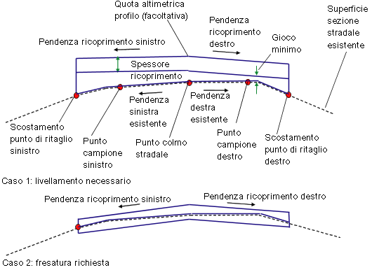 Viene determinata la pendenza della superficie esistente su ciascun lato tra i punti di colmo stradale e campione. Le pendenze degli strati di ricoprimento vengono determinate in base ai seguenti passaggi: