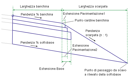Questo componente sezione tipo inserisce una banchina pavimentata con lo strato di sottobase esteso ad un punto di fine scarpata.