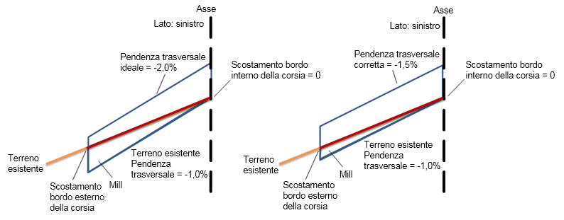 La pendenza trasversale corretta è sempre impostata sullo stesso valore della pendenza del terreno esistente.