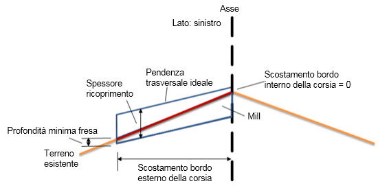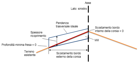 La pendenza trasversale e le regolazioni della quota altimetrica soddisfano Spessore livello minimo e/o Spessore fresatura minimo. La base è la superficie esistente.
