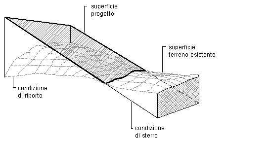 Il metodo volume da superfici utilizza i punti di due superfici, oltre che tutte le posizioni in cui i lati di un triangolo si incrociano tra due superfici. I volumi di riporto, di sterro e netto vengono calcolati in base alle differenze di quota altimetrica tra le due superfici.