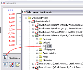- Nella finestra di dialogo Seleziona riferimento, espandere Giunti standard > Prismatico (Guide:1, Scottish Yoke:1) per visualizzare la cartella delle velocità e il relativo contenuto. Fare clic su V(1) per specificare la velocità come variabile per l'asse X del grafico.