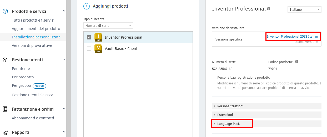 Passare a Installazione personalizzata nel riquadro sinistro, selezionare la versione della release di Inventor, espandere l'elenco a discesa Language Pack e selezionare i Language Pack da installare.