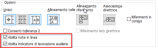 È inoltre possibile immettere indicatori di lavorazione prefisso, suffisso e ausiliari in base allo standard ISO 5458 & 5459 nella finestra di dialogo Riquadro di controllo della geometria. Innanzitutto, abilitare le opzioni utilizzando le nuove caselle di controllo aggiunte alla finestra di dialogo Editor stili e norme. Osservare inoltre che le celle vengono abilitate mentre si completano.