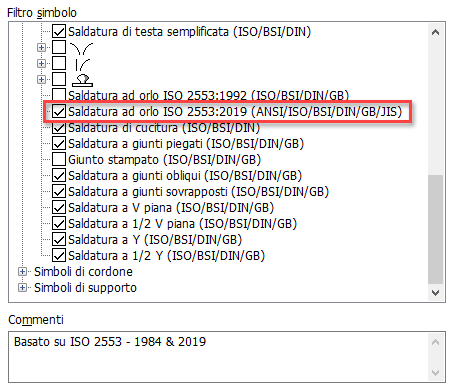 Ora i simboli di saldatura ad orlo utilizzano l'ultima versione dello standard ISO 2553-2019 disponibile. Il simbolo viene aggiunto all'editor di stili e attivato per default per gli standard ISO, DIN, ANSI, BSI, GB, JIS e GOST (solo in assieme saldato).