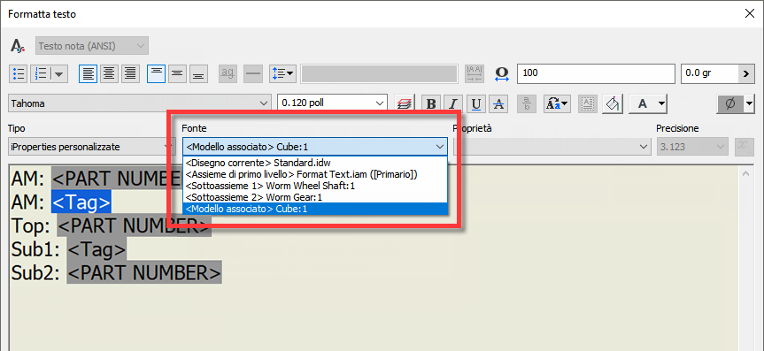 Ora la nota con direttrice 3D e 2D può includere iProperties standard, iProperties personalizzate e le proprietà istanze appartenenti agli elementi primari della parte associata. In precedenza, solo le proprietà della parte associata erano disponibili nella nota con direttrice.