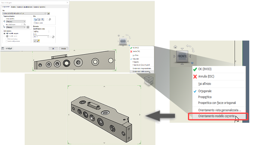 È ora possibile posizionare una vista di base con l'orientamento della vista del modello corrente. Fare clic sull'elenco a discesa ViewCube e selezionare Orientamento vista corrente.
