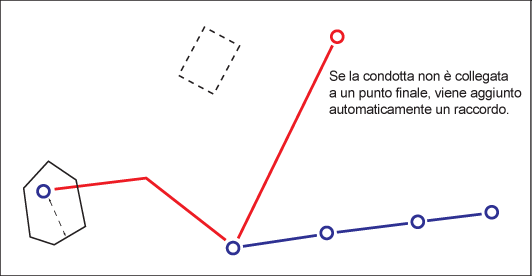 - Se si crea una condotta con un'estremità non connessa ad un punto di rete, per default viene generato un raccordo. Vedere Regola di entità geografica: Crea nodo iniziale/finale.