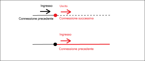 - Secondo caso: il disgiuntore è dotato di ingresso, ma non di uscita. Questo implica che il disgiuntore è dotato di connessione in avanti. Il disgiuntore viene connesso al conduttore all'indietro e il nuovo conduttore viene connesso come ingresso, all'indietro rispetto al disgiuntore.