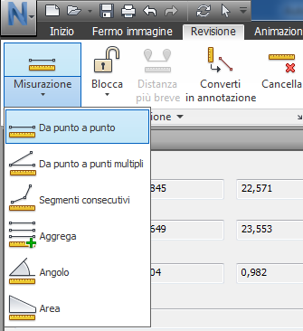 Gli strumenti di misurazione consentono di misurare la distanza tra i punti sugli elementi nel modello. Tutte le misurazioni vengono eseguite in unità di visualizzazione. Gli strumenti di misurazione sono disponibili nella scheda Revisione > gruppo Misurazione.