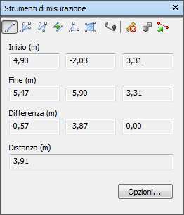 Per tutte le misurazioni, le coordinate X, Y e Z del punto iniziale e del punto finale vengono visualizzate nelle caselle di testo, insieme alle informazioni sulla differenza e sulla distanza assoluta. Se si utilizza una misurazione aggregata, come Segmenti consecutivi o Aggrega, la distanza aggregata per tutti i punti registrati nella misurazione viene visualizzata in Distanza.