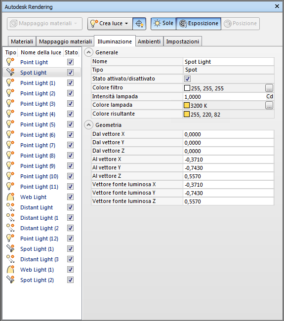 Utilizzare la scheda Illuminazione per gestire le luci nel modello.