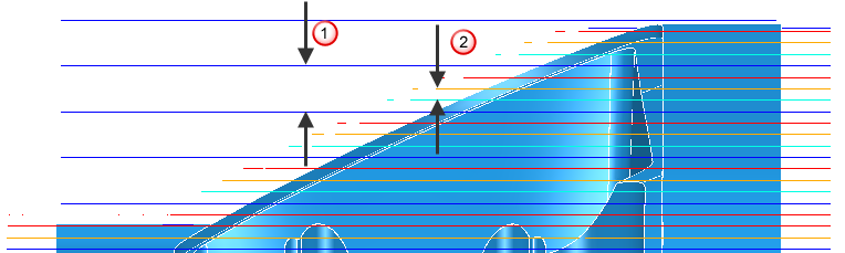 Use the Step cutting page to create intermediate toolpath slices that reduce terracing. It rest machines the terraces remaining from a large area clearance toolpath with the same tool in the same toolpath.