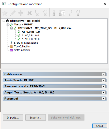 Per visualizzare e gestire il database sonde e visualizzare i dettagli di calibrazione di una macchina CMM, fare clic sulla scheda Strumenti > pannello Macchina > Sonde. I dettagli della sonda in uso e le relative calibrazioni attuali vengono visualizzati nella finestra di dialogo Configurazione macchina.