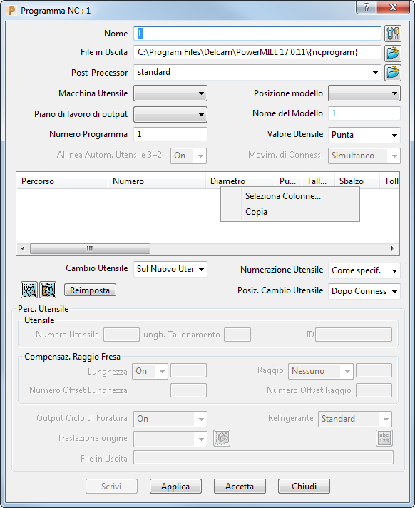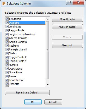 Utilizzare la finestra di dialogo Seleziona colonne per personalizzare le visualizzazioni delle colonne. Questa operazione consente di controllare e definire le priorità della quantità di informazioni visualizzate nelle finestre di dialogo Programma NC e Database utensili.
