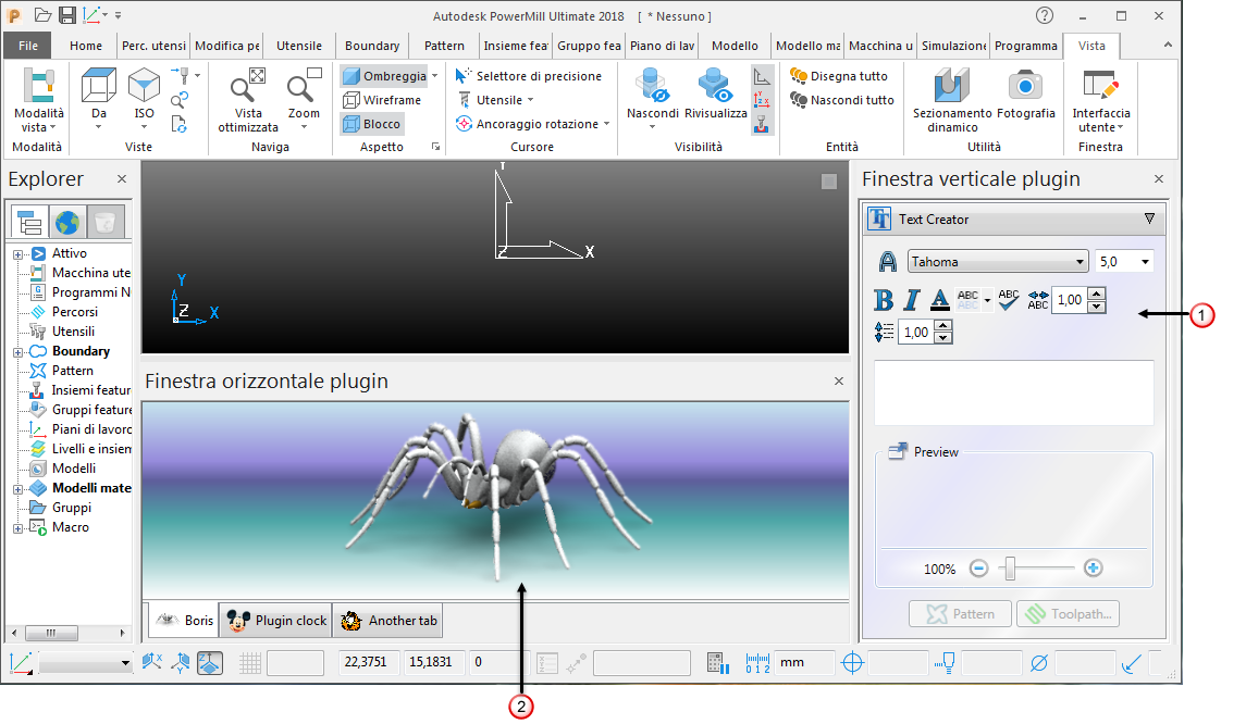 È possibile aggiungere a PowerMill plugin per adattare una soluzione di lavorazione in base alle proprie esigenze. I plugin vengono sviluppati al di fuori dell'applicazione principale di PowerMill ma sono progettati per interagire completamente con essa. I plugin vengono visualizzati nella finestra orizzontale plugin o in quella verticale (non è possibile scegliere).