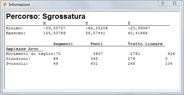 Fare clic sulla scheda Percorso > pannello Informazioni > Proprietà per visualizzare il nome, le estensioni e le informazioni sui movimenti di taglio per il percorso utensile attivo.