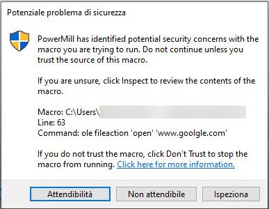 In PowerMill viene eseguito un controllo dei potenziali problemi di sicurezza quando si eseguono macro dall'interno del PowerMill. Se sono presenti problemi di sicurezza all'interno della macro, quali comandi potenzialmente dannosi, l'utente riceve un messaggio da PowerMill che chiede di controllare tali comandi e stabilire se è sicuro eseguirli: