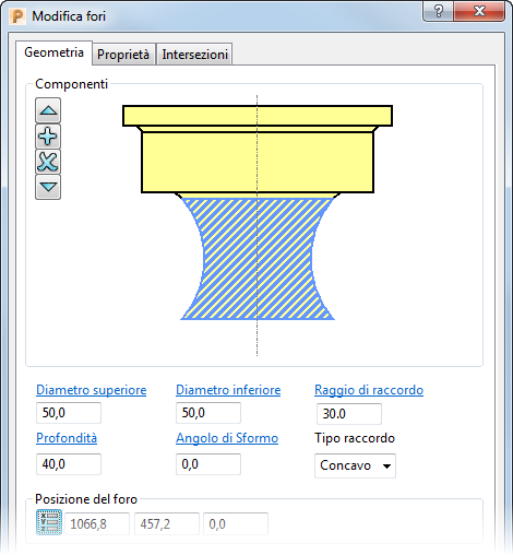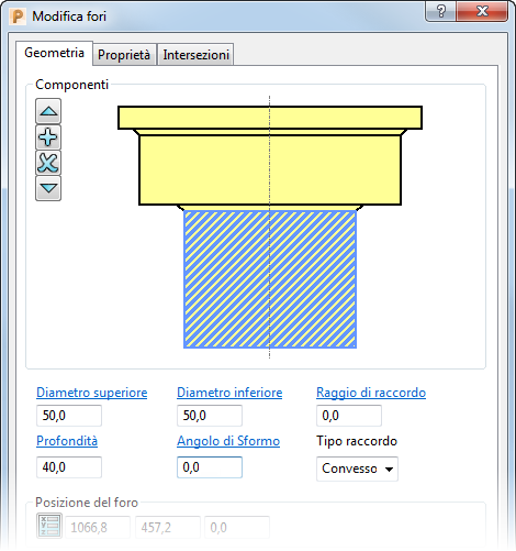 La scheda Geometria nella finestra di dialogo Modifica foro modifica un componente di un foro.