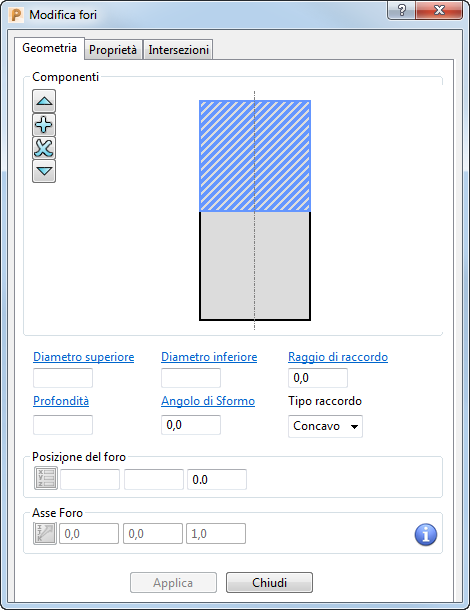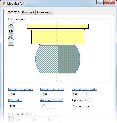 La grafica visualizza il foro che si sta modificando. Per fori composti, il componente che è possibile modificare al momento è tratteggiato in blu. Per modificare un componente diverso, selezionarlo nel pannello della grafica.