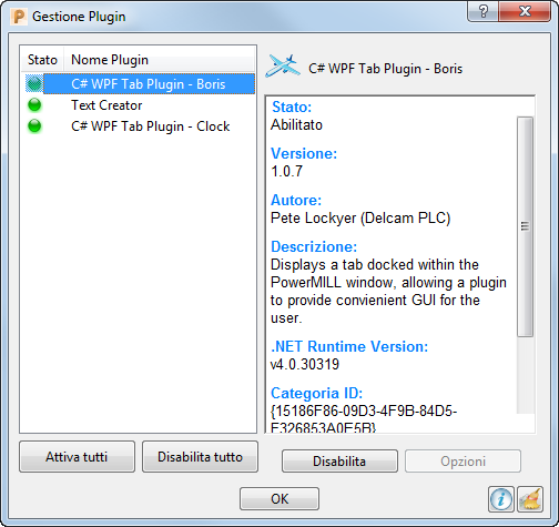 — il plugin richiede una versione più recente di PowerMill per poter essere eseguito. PowerMill può caricare il plugin e visualizzarne i dettagli.