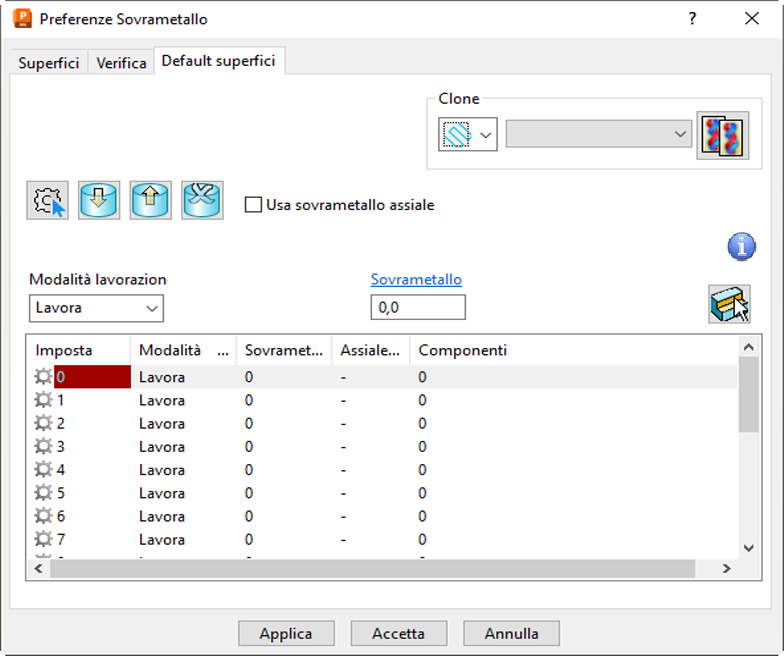 Questa è simile alla scheda Superfici, ad eccezione del fatto che i valori applicati qui sono valori predefiniti applicati a tutti i nuovi percorsi utensile e boundary. Qualsiasi percorso utensile o boundary esistente non viene alterato da alcuna modifica apportata qui.