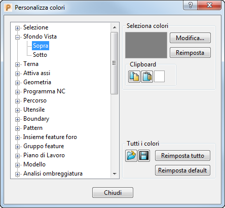 Per modificare i colori dello sfondo, fare clic sulla scheda File > Opzioni > Personalizza colori e scegliere Sfondo vista. É possibile modificare i colori Sopra e/o Sotto e scegliere le funzioni Reimposta tutto o Reimposta default in caso di successive modifiche.