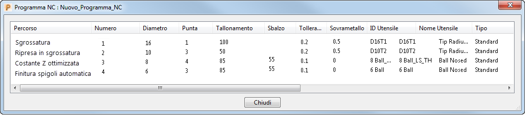 È possibile visualizzare tutti i percorsi utensile utilizzati in un programma NC e i parametri usati per creare i percorsi utensile.
