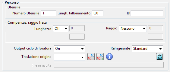 Nella parte inferiore della finestra di dialogo Programma NC è possibile visualizzare e modificare le impostazioni per ciascun percorso utensile nel programma NC. Per visualizzare le impostazioni di un percorso utensile, selezionare il percorso dall'elenco Perc. utensile.