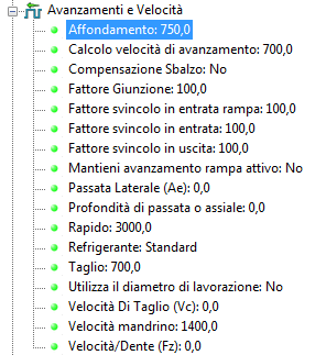Per osservare il risultato delle modifiche, selezionare uno dei percorsi utensile ed estendere la sezione Avanzamenti e velocità nella finestra dell'explorer.