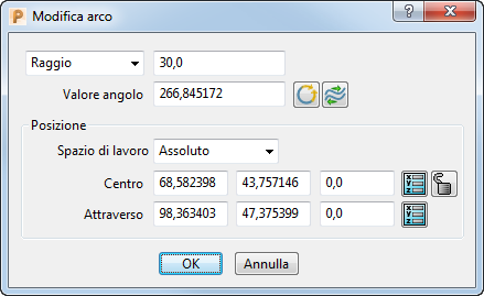 Usare la finestra di dialogo Modifica arco per modificare un arco o un cerchio. Per visualizzare la finestra di dialogo Modifica arco, fare doppio clic su un arco quando è visualizzata la scheda Modifica curva.
