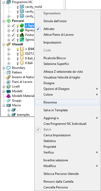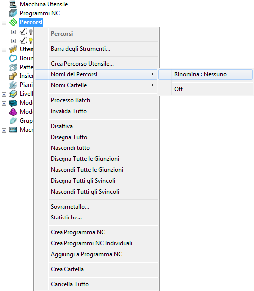 sulla finestra di dialogo per modificarli).Gli elementi del menu contestuale per entità specifiche, sotto ad un'entità collettiva, contengono gli stessi comandi. Per esempio, le opzioni del menu per tutti i percorsi utensile specifici sono le stesse.