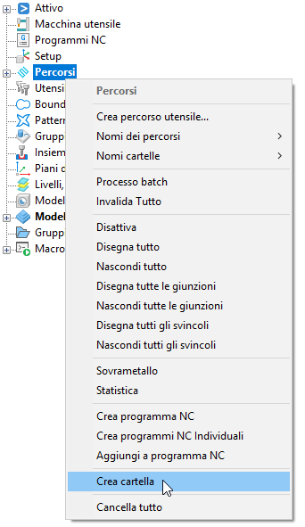 Crea cartella — Selezionare questa opzione per creare una cartella denominata Cartella1. È possibile rinominare questa cartella nel modo consueto, quindi trascinare entità di un determinato tipo al suo interno (ad esempio, i percorsi utensile in una cartella di percorsi).