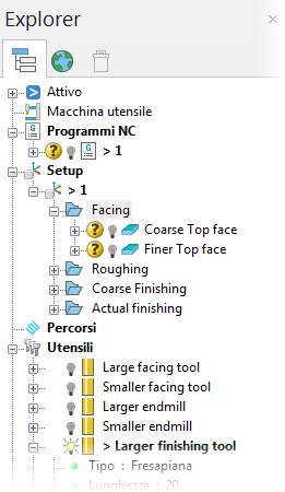 Nell'Explorer vengono visualizzate le entità utilizzate nei progetti PowerMill (il termine Entità si riferisce in senso lato a tutte le voci presenti nell’Explorer). Le entità presenti nell'Explorer vengono raggruppate in base al tipo; ad esempio, i percorsi utensile sono raggruppati nel ramo Percorsi utensile, mentre gli utensili sono raggruppati nel ramo Utensili. Dato che i progetti PowerMill contengono spesso numerose entità, l'Explorer utilizza un sistema Attivo per indicare le entità su cui focalizzarsi.