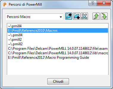 Per riordinare i nomi dei percorsi nell'elenco delle macro, selezionare Percorsi macro dal relativo menu. Ciò consente di visualizzare la finestra di dialogo Percorsi di PowerMill.