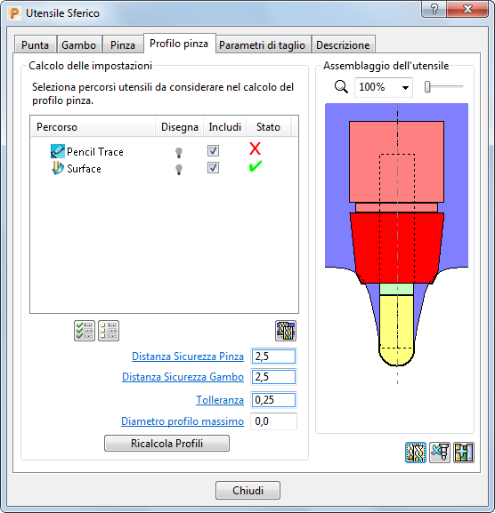 6. Fare clic su Ricalcola profili per calcolare il profilo pinza e vedere se la pinza collide con il modello.