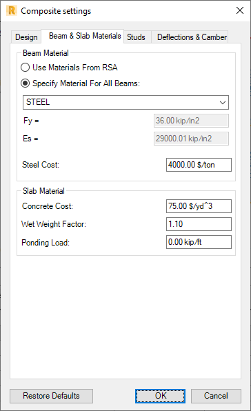 Beam and slab materials - settings: