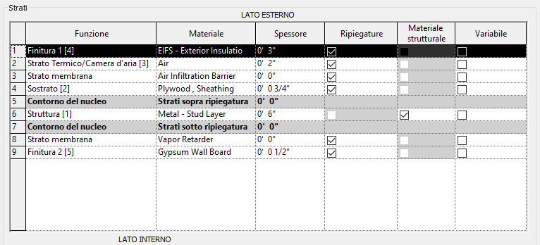 Gli strati sono assegnati ad una riga. Presentano uno spessore uniforme che si estende per l'intera altezza del muro. Lo spessore dello strato può essere modificato nella riga a cui è assegnato. È inoltre possibile assegnare un materiale ad ogni strato.