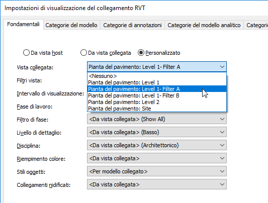 - Nella finestra di dialogo Impostazioni di visualizzazione del collegamento RVT, nella scheda Fondamentali, effettuare le seguenti operazioni: