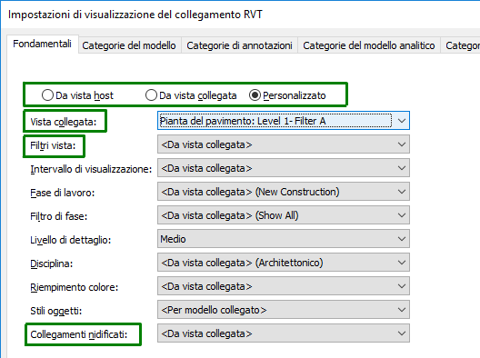 | Filtro vista | Disponibile solo per l'opzione Personalizzato. Specifica se il modello collegato viene visualizzato utilizzando il filtro applicato alla vista collegata o alla vista host. Non controlla la visualizzazione dei modelli nidificati. |