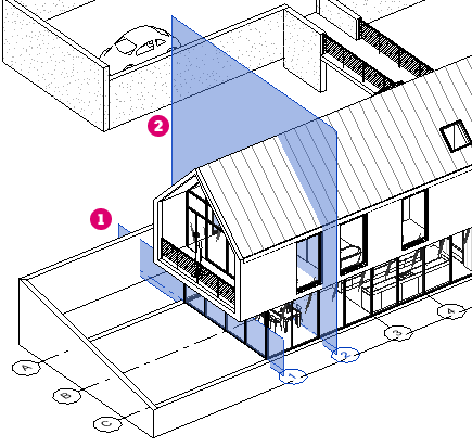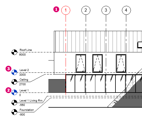 si estendono sul tetto del modello. Per questo motivo, la linea di griglia "1" non viene visualizzata nella pianta del pavimento del secondo livello, mentre le estensioni della griglia non intersecano il livello 2.
